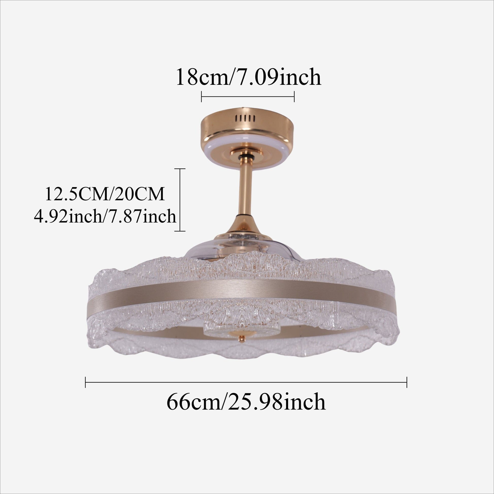 Deze moderne plafondventilatorlamp heeft een verbluffend dubbel-ring kristal acryl ontwerp, dat een elegante en luxe touch aan elke ruimte toevoegt. De gouden aluminium-koper afwerking complementeert het ingewikkeld getextureerde acryl en creëert een schitterend visueel effect dat uw woningdecoratie versterkt.