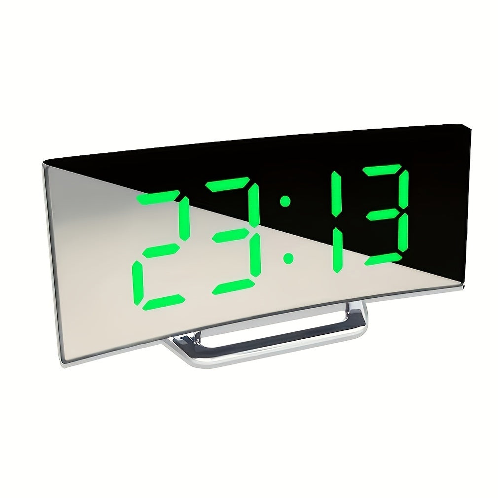 Deze moderne digitale wekker heeft een gebogen spiegel-LED-display met instelbare helderheid, uitstekend geschikt voor een strakke tijdweergave in huis of op kantoor. Hij werkt zowel op USB als batterijen en biedt de keuze tussen draadloos of aangesloten gebruik. Het stille alarm zorgt voor een rustige slaapomgeving, en het LED-scherm toont de temperatuur en past automatisch de helderheid aan.